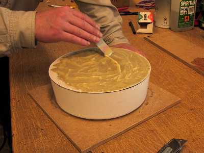 Schon nach dem Grobschliff kann man für das spätere Polieren einen Gipsabdruck anfertigen. Dafür wird wieder ein Eimer zerschnitten und über den Spiegel gepresst. Um die Oberfläche zu schützen wird vorher eine Frischhaltefolie auf den Spiegel gelegt.